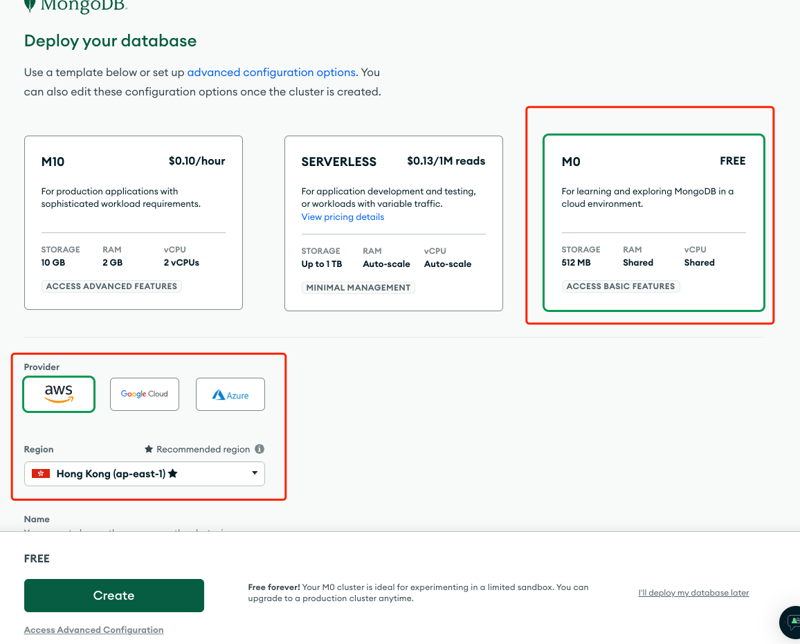 在注册并登录 MongoDB Atlas 后,您需要创建一个新的集群,以存储和管理您的数据。